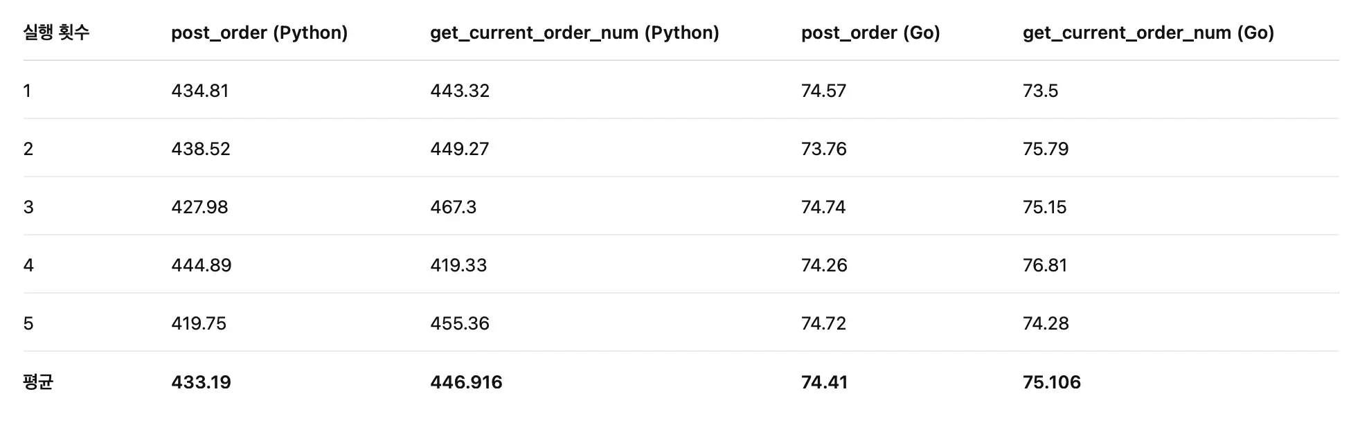 프로젝트에서 가장 많이 호출되는 API인 주문 등록하기(post_order) 메서드와 주문번호 가져오기(get_current_order_num) 메서드를 기존 Python 실행시간과 새로 작성한 Go 실행시간을 비교하여 측정했습니다.