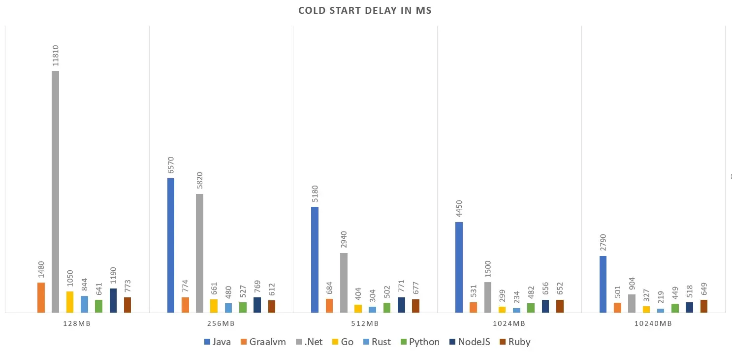 고민이 깊어지는 와중에, 블로그 작성자가 각 프로그래밍 언어를 가지고 메모리별로, Cold Start 실험을 하고, 소요 시간을 평균으로 계산한 그래프를 발견했습니다.