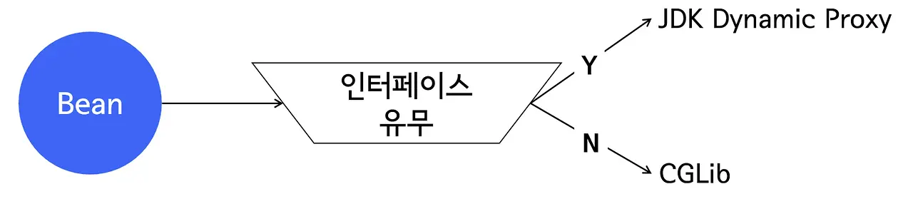 이때 만약 타깃이 하나 이상의 인터페이스를 구현하고 있는 클래스라면 JDK Dynamic Proxy의 방식으로 생성되고 인터페이스를 구현하지 않은 클래스라면 CGLIB의 방식으로 AOP 프록시를 생성한다.